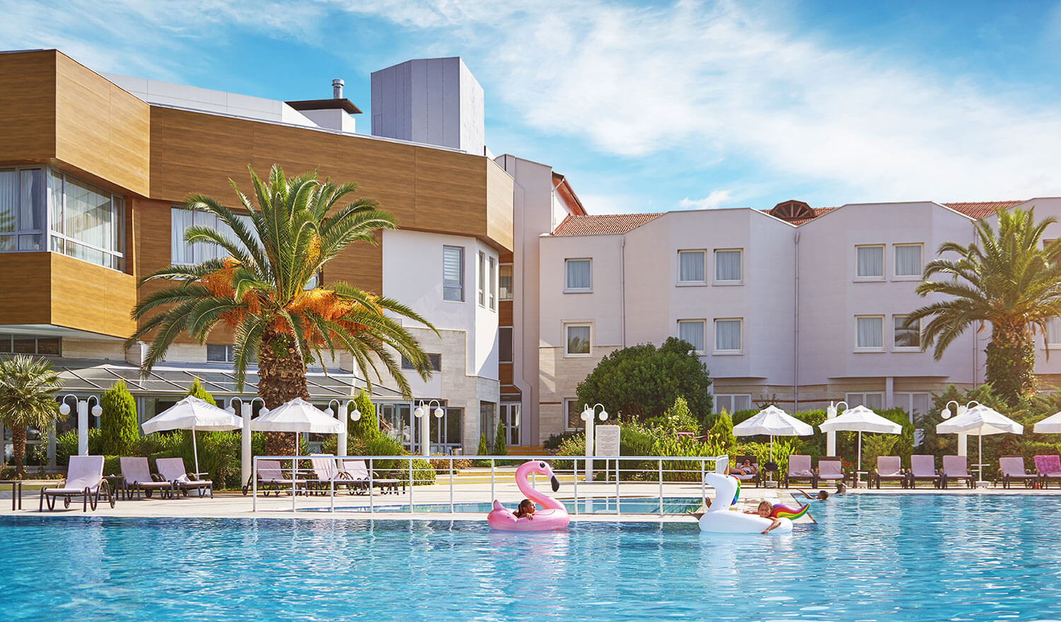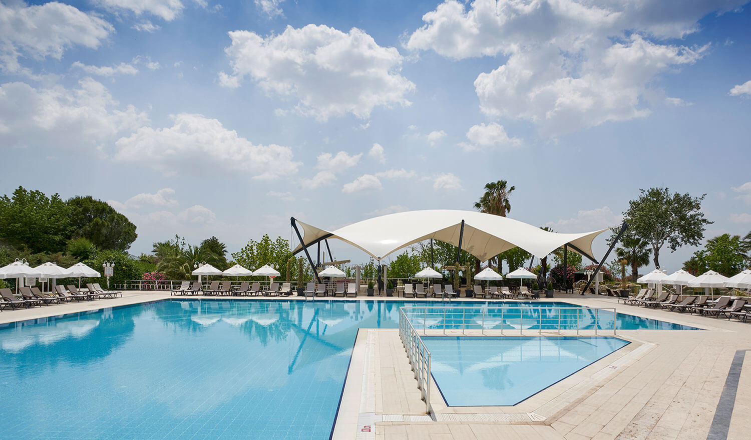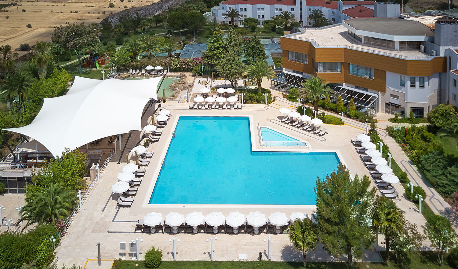 Toplam 264 odası bulunan tesiste, Açık-kapalı termal havuz, Açık havuz, çocuk havuzu ve soğuk şok havuzu mevcuttur.
